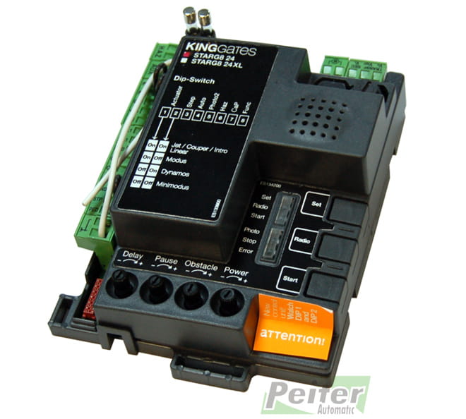 Centrala sterująca STARG8 24 została zaprojektowana do obsługi 1 lub 2 siłowników 24 Vdc firmy King Gates, np. Linear 400 24V, Linear 500 24V, Jet 24V, Couper 24V, Modus, MiniModus, Dynamos 600 24V, Dynamos 1000 24V.