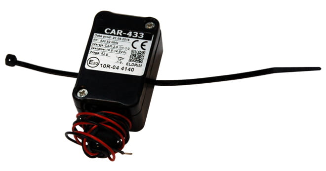 Urządzenie CAR-433E przeznaczone jest do zdalnego sterowania bramą lub innym odbiornikiem za pomocą przełącznika monostabilnego. Jest to 4-kanałowy nadajnik radiowy. Według ustawień fabrycznych nadaje w formacie Keeloq eLdrim i ze standardowym przypisaniem przycisków. Idealnie nadaje się do zastosowań transportowo-magazynowych. Można go zainstalować w wózkach widłowych lub innych pojazdach mechanicznych z zasilaniem 12V do sterowania napędami bram.