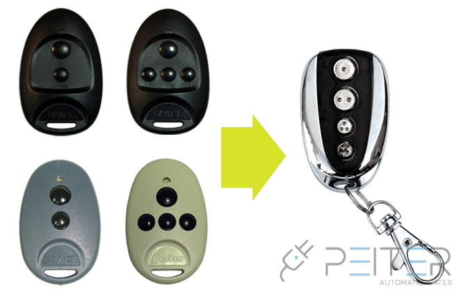 Pilot PODKOWA działa jako zamiennik pilotów Came SPACE: SP2, SP4 z diodą LED świecącą na zielono.