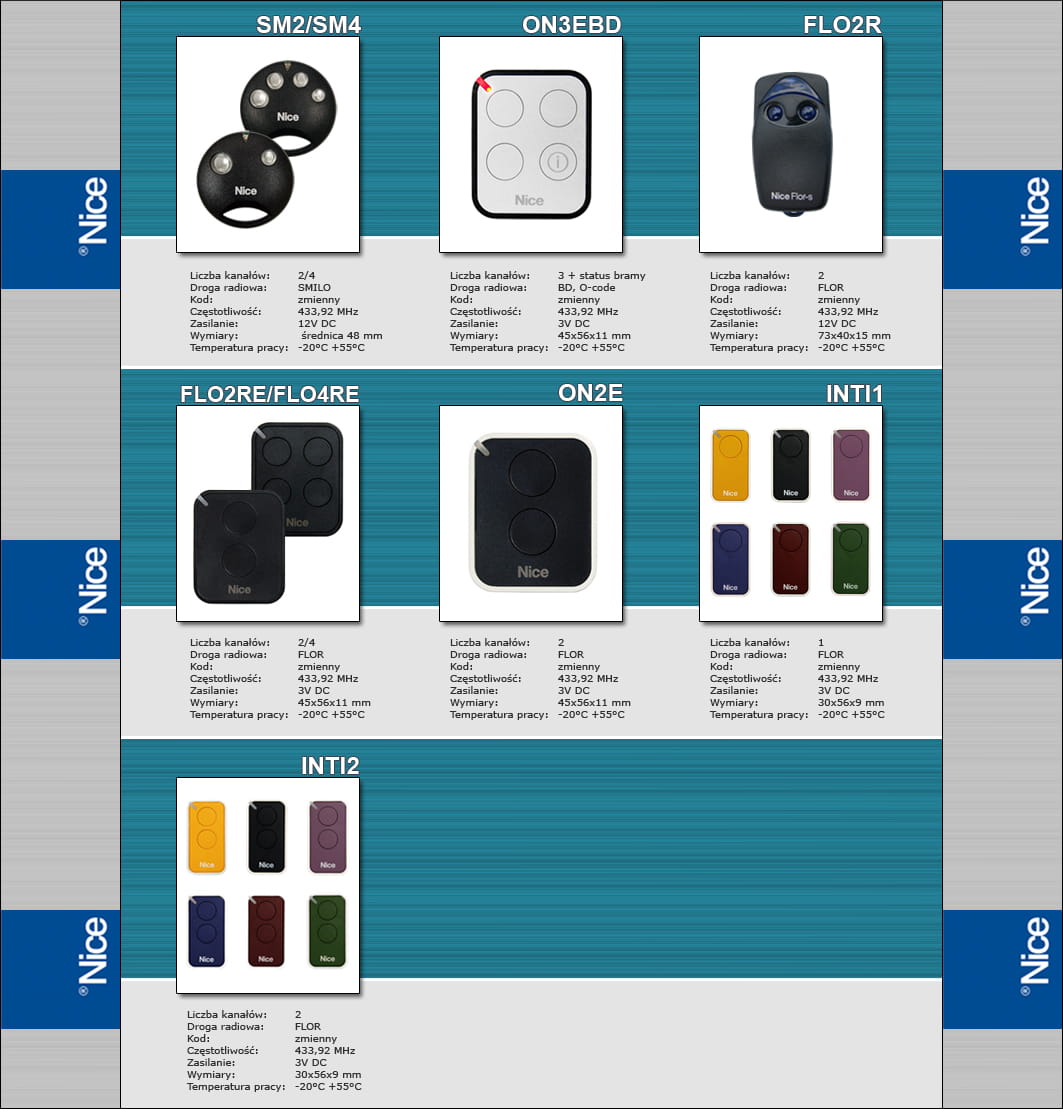 - wszystkie modele szlabanów Nice: WIDES, WIDEM, WIDEL, SBAR, M3BAR, M5BAR, M7BAR, LBAR